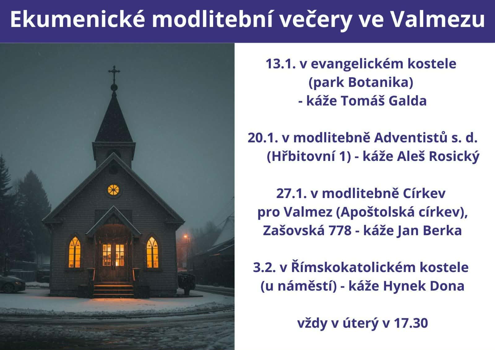 První setkání se uskutečnilo v úterý 13.ledna 2026 v evangelickém kostele. Kázáním sloužil pastor Apoštolské církve, nazývané též Církev pro region, Tomáš Galda. Čtení z Písma J 20:19-29. Téma kázání „Nevěřící Tomáš“. Vybral si ho právě kvůli svému jménu.